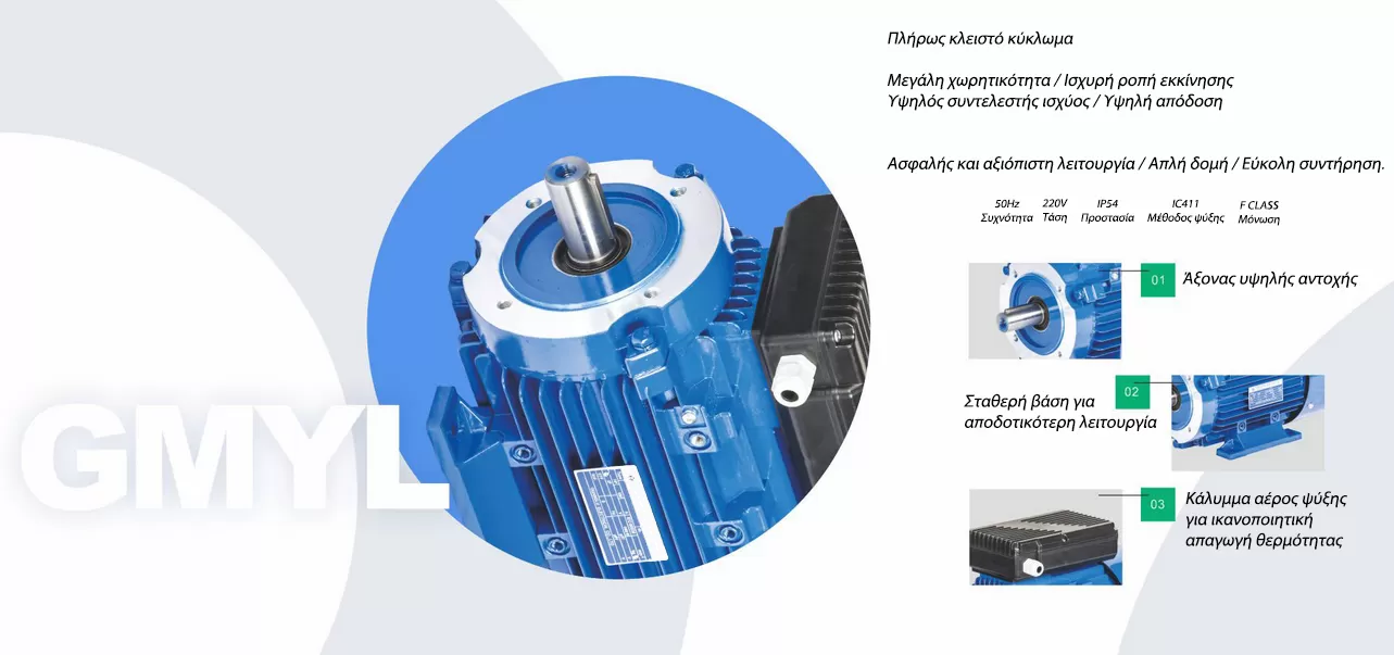 Μονοφασικοί ασύγχρονοι ηλεκτροκινητήρες (μοτέρ) βραχυκυκλωμένου δρομέα 4 πόλων (1400στροφές/λεπτό) με αυξημένη ροπή εκκίνισης, διακόπτη (εως 2hp) και καλώδιο. Εφαρμογές σε αεροσυμπιεστές, σπαστήρες κτλ.