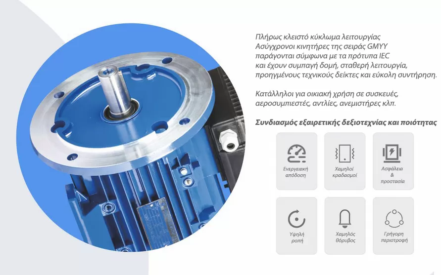 Μονοφασικοί ασύγχρονοι ηλεκτροκινητήρες (μοτέρ) βραχυκυκλωμένου δρομέα 4 πόλων (1400στροφές/λεπτό) με πυκνωτή λειτουργίας.