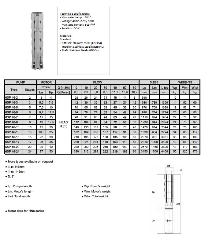 Ανοξείδωτη υποβρύχια αντλία γεωτρήσεως 6" 6SP 46-17