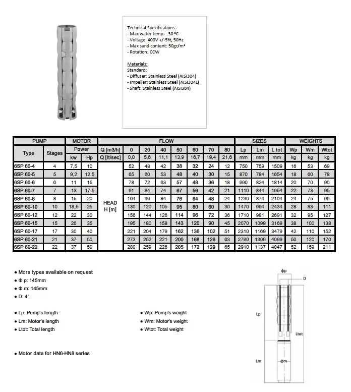 Ανοξείδωτη υποβρύχια αντλία γεωτρήσεως 6" 6SP 60-22