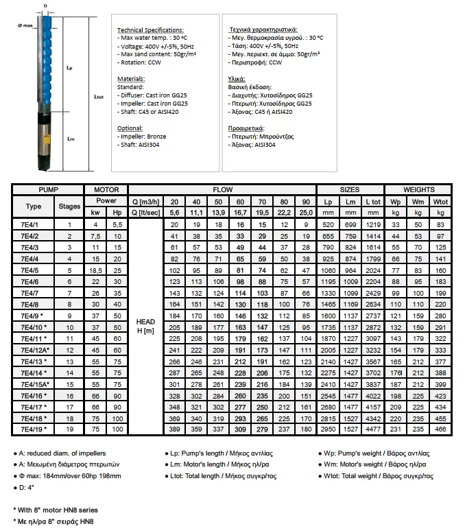Υποβρύχιες αντλίες κατάλληλες για άντληση καθαρού κρύου νερού. Εφαρμογές σε βιομηχανία, πιεστικά συστήματα, ύδρευση, άρδευση, πυρόσβεση κτλ.